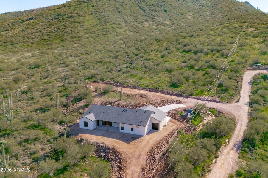 The 3-car garage is a standout feature—heated, cooled, and fully insulated, with one extra-deep bay and a pull-through door for toys, trailers, or a workshop. Enjoy desert living with stunning mountain views, surrounded by mature saguaro and access to nearby State Land for the outdoor enthusiast, all offered in a brand-new build designed with comfort and quality in mind.