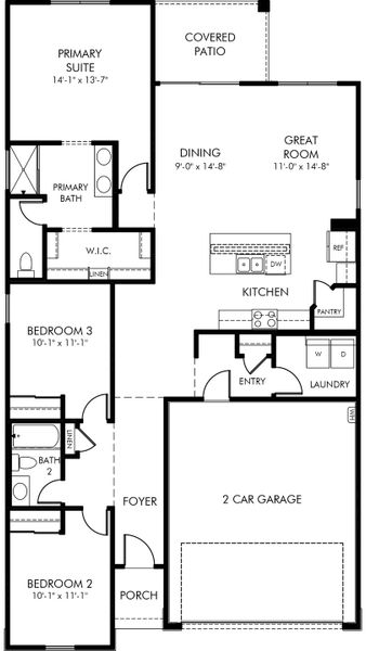 The Leslie features a large laundry, walk-in closet, and open kitchen with island for easy entertaining. Umber cabinets with grey countertop and tile flooring in the Cozy package.