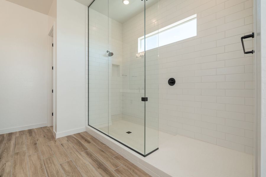 Experience modern luxury in this beautifully upgraded home. The great room features a stunning 12 ft. center-pull sliding glass door, creating seamless indoor-outdoor living. The kitchen shines with Benton painted white cabinetry, Ivory White quartz countertops, upgraded backsplash, and pendant lighting at the island. Durable 6 inch x 36 inch wood-plank tile flows throughout the main living areas, with carpeted bedrooms for comfort. The primary suite offers a walk-in shower in lieu of a tub and a private alternate entry, while the secondary bath includes a second sink. Matte black bathroom finishes, Snowbound interior paint, window coverings, upgraded front porch pavers, garage-to-house access at the Gen suite, soft water loop, and exterior gas stub complete this thoughtfully designed home.