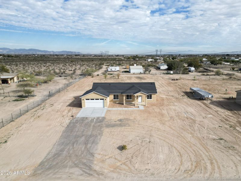 Brand-new construction built in 2025, this 4-bedroom, 2.5-bath home offers 1,819 sq ft of thoughtfully designed living space on a spacious 1.159-acre lot with no HOA. Enjoy 9-foot ceilings throughout, 8-foot solid core doors, upgraded closets, and ceiling fans in every room, creating a bright and comfortable living environment. The open-concept layout features tile flooring in the kitchen and living areas, a stylish kitchen backsplash, and stainless steel appliances, while the bedrooms are finished with plush carpet. Spray foam insulation and an insulated garage door enhance energy efficiency. The spacious laundry room adds everyday convenience, and the garage is upgraded with epoxy flooring and an electric vehicle charging outlet. Front and back patios also feature epoxy finishes, and the 22x22 driveway offers ample parking. Equipped with well and septic. Enjoy wide-open space with endless possibilities for RVs, animals, workshops, or future additions, all while experiencing peaceful desert living with convenient access to the Valley.
