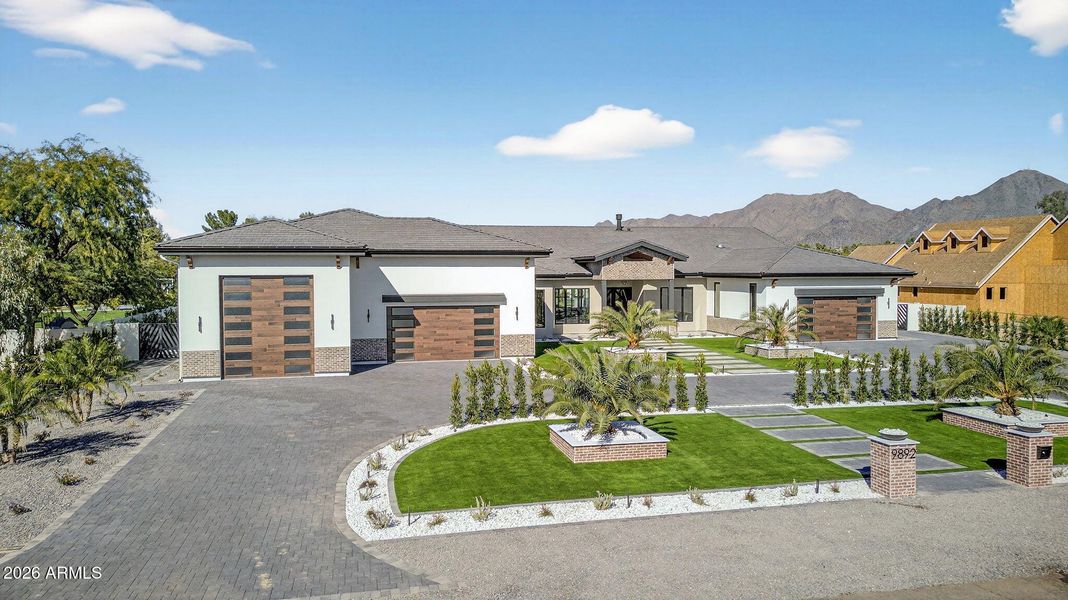 In the heart of Scottsdale's prestigious Cactus Corridor—an enclave revered for its rare large-lot serenity & timeless Sonoran beauty, this brand-new residence offers an exquisite expression of chic desert living on a generous 1.25-acre private lot. Here, warm contemporary modern meet clean architectural lines, softened by rich, organic textures, abundant natural light, and materials that celebrate the desert's quiet splendor, creating a home that feels both profoundly sophisticated and deeply inviting. The 7,930 sq ft master-split floorplan is composed for privacy and flow—the primary suite, a tranquil sanctuary on one wing, provides secluded elegance, while secondary bedrooms and communal spaces reside on the opposite side, allowing effortless connection without compromise. Soaring ceilings with blackened exposed beams and subtle linear LED lighting introduce quiet drama, while wide-plank white oak wire-brushed engineered hardwood glides beneath foot, infusing every room with natural warmth and understated refinement. The chef's kitchen is the soul of the home: custom spiced oak cabinetry by Superior, are a sleek flat-panel design, crowned by luminous Perlato Taj Quartzite. A monumental central island with waterfall edges and integrated black bases anchors the space. Wolf and Sub-Zero appliances (with GE Profile in the butler's pantry and office) perform with quiet authority. Living areas revolve around a breathtaking Italian Marvel Fior Di Bosco porcelain slab fireplaceits intricate, marble-like veining a sculptural masterpiece that draws the eye and warms the spirit. Secondary baths and laundry maintain this refined harmony with Della Citrine Quartzcreamy elegance accented by subtle grey-goldand matching spiced oak cabinetry, elevated by frameless glass showers, oversized black-edged mirrors, and slender vertical LED sconces that evoke a private spa retreat. Fully pre-wired for whole-home audio, security cameras, and advanced AV, the home anticipates every modern need with seamless grace. The garage compound is a collector's haven: expansive climate-controlled bays (including attached RV space) and additional insulated storage, accommodating 8 cars normally or 12 with lifts. Beyond the glass walls, the backyard unfolds as a private oasis of natural beauty and refined leisure: expansive covered patios (3,000 sq ft of covered) transition effortlessly to clean neutral-grey hardscaping, leading to a lighted half-court basketball area, a regulation pickleball court with premium SportMaster surfacing, a pristine putting green, and a shimmering pool. Crisp white privacy walls, graceful palms, and sweeping McDowell Mountain vistas frame the scene, turning every gathering into an experience of pure desert serenity. Curated with the finest materials, intuitive technology, and expansive grounds that embrace both privacy and possibility, this 6-bedroom, 7.5-bath residence is a rare embodiment of chic desert living.. elegant, natural, and profoundly luxurious. Step into elegance that feels like home.