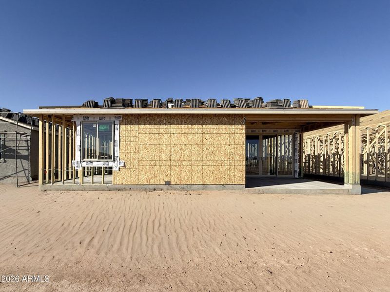 Welcome to the Lilac Plan, a thoughtfully designed 2,153 sq. ft. single-story home that offers the perfect blend of comfort, style, and functionality. This move-in-ready home features Modern Desert exterior with four spacious bedrooms, three bathrooms, a versatile den, and a three-car tandem garage. The open-concept layout invites you in, with a stunning chef-inspired kitchen at the heart of the home. Designed for both entertaining and everyday living, the kitchen includes a large island for meal prep and gathering, a walk-in pantry, and a full suite of stainless steel appliances including a range, microwave, dishwasher, and refrigerator. As part of the Foundry Collection, it also boasts grey 42'' upper cabinets, elegant quartz countertops, a mosaic backsplash, and prewiring for pendant lighting so you can easily customize your space. The main living areas feature wood-look plank tile flooring in all the right places, offering both beauty and durability. A 4-panel center sliding glass door opens the great room to a covered patio, creating a seamless indoor/outdoor living experience that's perfect for hosting family and friends. Throughout the home, you'll find thoughtful upgrades such as 8-foot interior doors, 2-inch white faux wood blinds, and carpet in the bedrooms. The home also includes a washer and dryer, a water softener loop system, and beautifully finished bathrooms with White Sand quartz countertops and oval sinks. With its refined design, quality finishes, and prime location, the Lilac Plan is truly a place you'll be proud to make home.