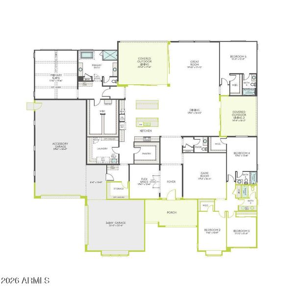 Exceptional 4,587 sq ft residence offering 5 bedrooms, 4.5 baths, and a 2-bay garage with an attached accessory garage and service door. The chef's kitchen is a true showpiece with stacked Stately Series cabinetry, double islands with quartz countertops, and stainless GE Café appliances. Expansive multi-panel sliders at the kitchen, great room, and dining area create seamless indoor-outdoor living to the covered patio. An elegant iron entry door sets the tone for this thoughtfully designed home. Finished with paver driveway, this property delivers luxury, functionality, and space for every lifestyle.