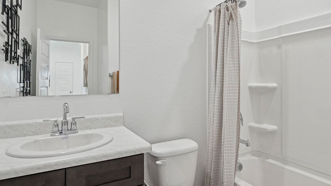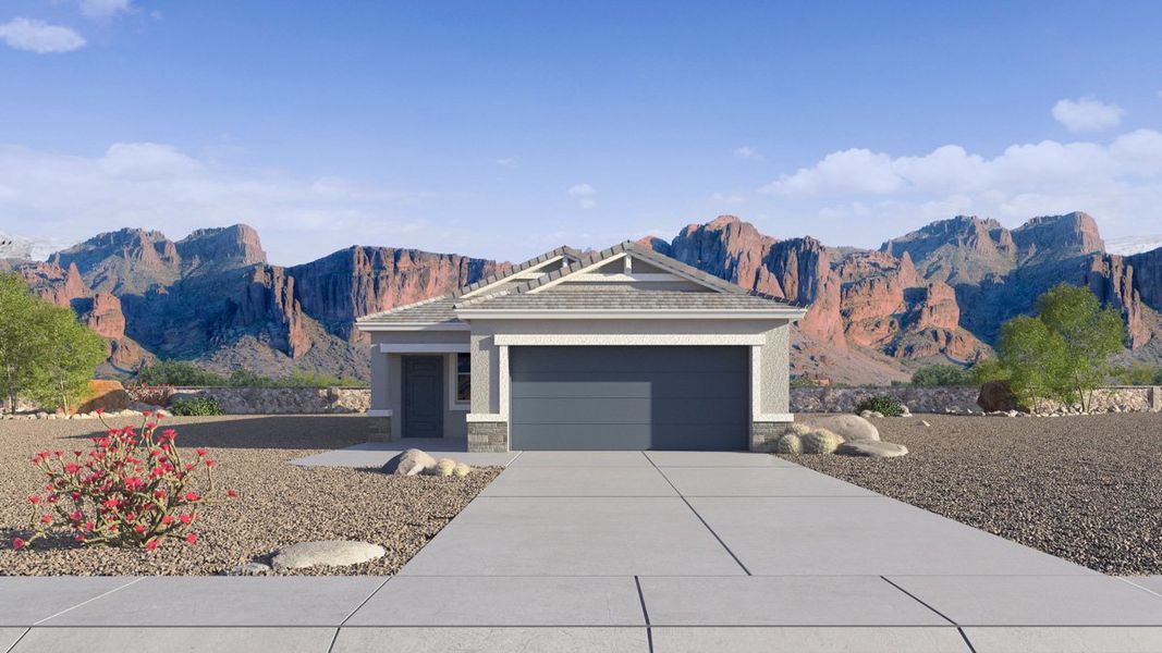 The Amber floor plan is a single-story home featuring 3 bedrooms, 2 bathrooms, and a 2-car garage with a third-car option. This plan extends 1,330 sq. ft., perfect for cozy modern living. As you enter, you're greeted by a large, open great room that seamlessly integrates the kitchen and dining area. This open-concept design fosters an inviting atmosphere, ideal for both large social gatherings and casual dining. The kitchen features modern appliances, substantial counter space, and a large island. The primary bedroom includes a large walk-in closet, offering abundant storage and organization. The bathroom features dual-sinks and a spacious shower, ensuring relaxation. The two additional bedrooms provide comfortable spaces that can be adapted for the needs of any resident. The covered backyard patio is another highlight of the home, providing an ideal space for quiet outdoor reflection or entertaining. Located in the vibrant community of Radiance at Superstition Vistas.
