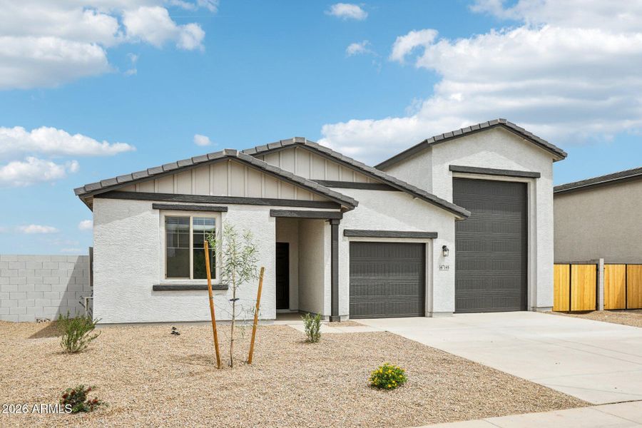 Sol at Amarillo Creek in Maricopa! 2,178sf, 3 bed, 2.5 bath + den on a premium corner lot with 8' gate and rare 4-car RV garage. Farmhouse elevation with Timeless Ashton Woods Collection. Features include white 42'' upper cabinets with satin nickel hardware, quartz countertops, white herringbone tile backsplash, wood-plank tile in common/wet areas, and stainless electric appliances incl. fridge + matching washer/dryer. Insulated RV garage, pendant light pre-wire, and 4-panel center slider for seamless indoor/outdoor living.