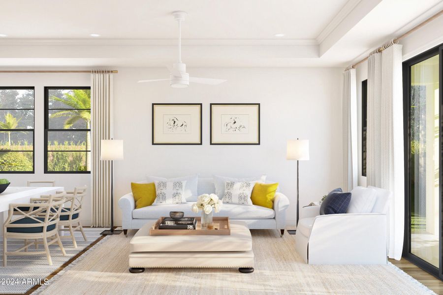 Experience the best of active adult living at Victory at Verrado, a premier 55+ community known for its resort-style amenities and vibrant lifestyle. The thoughtfully designed Blueberry Ash plan showcases Classic-inspired finishes and elegant details throughout. A coffered ceiling adds character to the spacious great room, while a 9-foot multi-slide glass door opens to a covered patio, creating effortless indoor-outdoor living. The gourmet kitchen is a true centerpiece, featuring a large island with pendant lighting, Soapstone Mist quartz countertops, white cabinetry, and GE Profile stainless steel appliances, including a refrigerator. The tranquil primary suite offers a spa-like bath with an upgraded no-step shower, providing the perfect place to relax and recharge. ^^Up to 6% of Base Price can be applied towards closing cost and/or short-long-term interest rate buydowns when choosing our preferred Lender. Additional eligibility and limited time restrictions apply. Ask for more information!