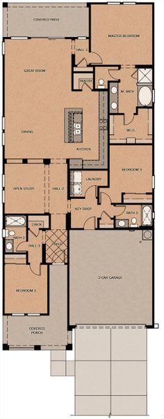 The Jericho is over 1900 square feet, 3 bedrooms, 3 full baths, open study and a two car garage.