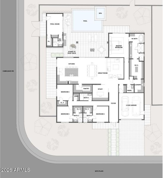 Introducing one of the most unique new construction homes in South Scottsdale, scheduled for completion in late May/early June 2026. This thoughtfully designed residence features 5 bedrooms, 5 bathrooms, a dedicated private office, and a detached casita/pool house with a full bedroom and bathroom, offering exceptional flexibility for guests or private living quarters. The home was intentionally positioned to capture breathtaking views of Camelback Mountain throughout the property, including from the primary suite enclave, expansive great room, and the signature rooftop walk deck creating a perspective rarely seen in South Scottsdale. Designed for both everyday living and elevated entertaining, the property showcases premier finishes throughout, including Wolf and Sub-Zero appliances, Delta fixtures, quartz countertops, and wide-plank wood flooring. Whether used as an entertainer's dream or a luxury lock-and-leave retreat, the property offers a rare level of privacy at the very end of Camelback Road with minimal through traffic.