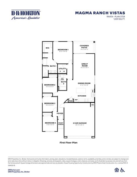 The Raven floor plan is a single-story home including 4 bedrooms, 2 bathrooms, and a spacious 2-car garage with direct access to the interior. Spanning 1,559 sq. ft., this home combines functionality with a modern open-concept layout. The entrance of the home opens to a welcoming foyer that leads past three secondary bedrooms and a full bathroom before opening to the main living spaces. The great room is bright and airy, seamlessly connecting to the dining room and kitchen for easy entertaining and everyday living. The kitchen features modern appliances, a walk-in corner pantry, and a central island that doubles as a breakfast bar. The primary bedroom is privately situated at the back of the home and includes a generous walk-in closet and a well-appointed bathroom with dual sinks and a walk-in shower. The three additional bedrooms are spacious and versatile, making them ideal for family, guests, or a home office. The second bathroom is conveniently located near these bedrooms and includes a shower/tub combination and stylish vanity. Additional highlights include a laundry room with washer/dryer connections, a covered back patio for outdoor enjoyment, and a welcoming front porch. Located in the Magma Ranch Vistas community.