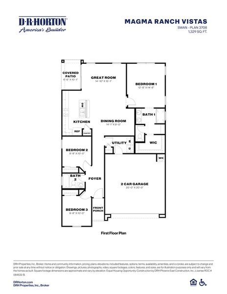 The Swan floor plan is a single-story home including 3 bedrooms, 2 bathrooms, and a 2-car garage with direct access to the interior. Spanning 1,329 sq. ft., this home offers an inviting and efficient layout. The entrance of the home opens to a foyer that leads past two secondary bedrooms and a full bathroom, guiding you into the open living and dining spaces. The great room is bright and welcoming, flowing effortlessly into the dining room and kitchen. The kitchen includes modern appliances, a corner pantry for storage, and a central island with a sink and counter seating that overlooks the great room. The primary bedroom is thoughtfully located at the back of the home for added privacy. This bedroom includes a spacious walk-in closet and bathroom with modern fixtures and a walk-in shower. The two additional bedrooms are well-proportioned, each with ample closet space and natural light, and are conveniently located near the second bathroom with a shower/tub combination. The home also includes a laundry room, a welcoming front porch, and a backyard area with a covered patio—perfect for outdoor dining or relaxation. Located in the Magma Ranch Vistas community.