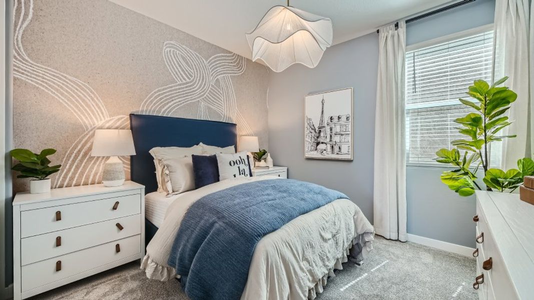 In this new two-story home, a secondary bedroom and full bathroom can be found off the entry, leading to an open-concept layout consisting of a kitchen, dining room and Great Room. A covered patio offers enhanced outdoor living directly off the main living area. Upstairs, three bedrooms including the luxe owner’s suite surround a versatile loft.