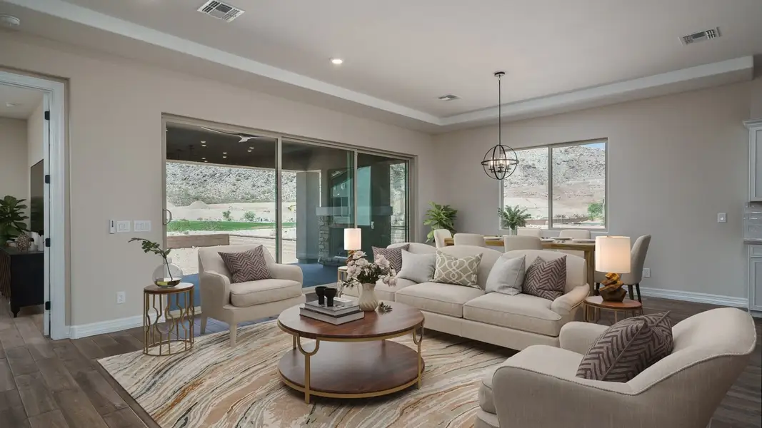 The Sawgrass II features a flowing, open-concept layout that seamlessly connects the great room, kitchen, and café dining area. The well-appointed kitchen includes a large walk-in pantry and a generous cabinetry.