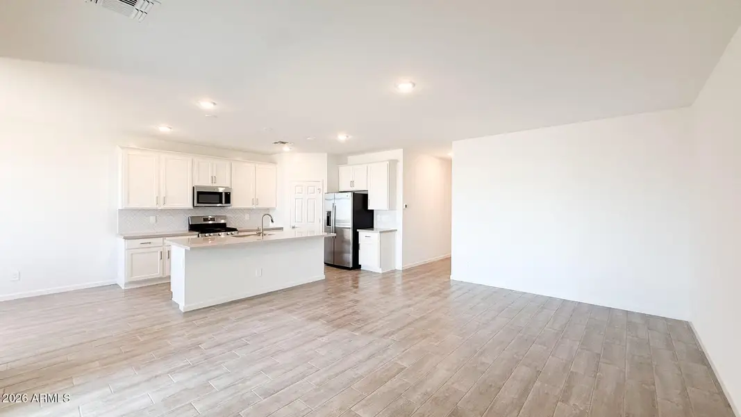 The open-concept layout features a dining nook and great room. The kitchen showcases the Timeless Collection finishes including white 42'' upper cabinets, Ivory White Quartz countertops, Backsplash, and Hardware.