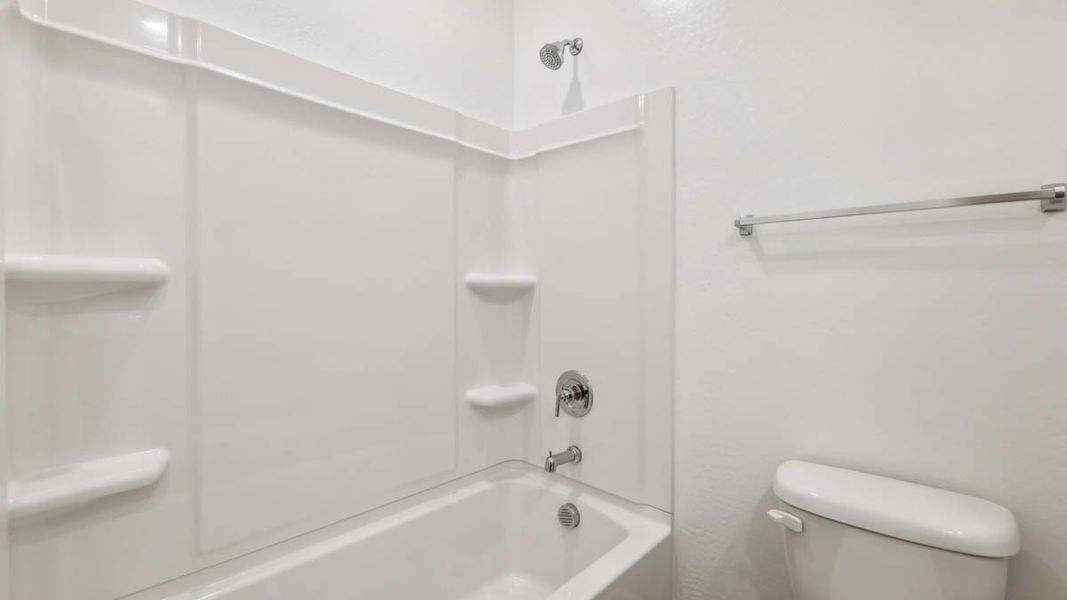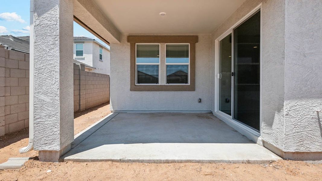 The Jerome floor plan, encompassing 2,444 sq. ft., offers 5 bedrooms, 3 bathrooms, and a 3-car garage. This spacious layout welcomes you in with a bright foyer leading to the inviting living room. The living room features bright windows allowing natural light to flood in and sits adjacent to the kitchen. This space features high-end appliances, ample counter space, and an abundance of cabinetry. The kitchen island also provides additional seating and workspace, ideal for casual meals. The dining area connects to both rooms, offering a cozy yet functional space for meals and entertaining. The primary bedroom is a private retreat located in a more secluded part of the home, featuring a spacious layout and a large walk-in closet. In addition, this space includes a private bathroom equipped with modern fixtures, a large shower, and optional dual sinks. The four additional bedrooms provide plenty of space and privacy for guests. Each room is well-lit and versatile, conveniently located near a full bathroom with a shower/tub combination. The home also includes a laundry room, multiple closets, and storage areas to ensure belongings can be neatly organized and accessible. A covered outdoor patio serves as an ideal space for outdoor dining and entertaining, continuing the open-concept living area to the backyard. Located in the community of Magma Ranch Vistas.
