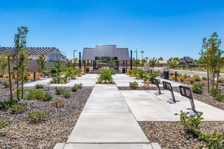 Modern Cottage exterior and a south facing lot; Approx 2500 sq ft of modern living space with 4 bedrooms and 2.5 baths. The 3-car garage with paver driveway and double gate to back yard. 10' beamed ceilings, 8' doors and multi sliding glass door at Great Room opens to a covered patio, creating a perfect flow between indoor and outdoor spaces. The gourmet kitchen with double-stacked custom cabinets and Black Stainless LG appliances; Large laundry with cabinets and sink. Gated community with a park, playground, community orchard, BBQs and ramadas.