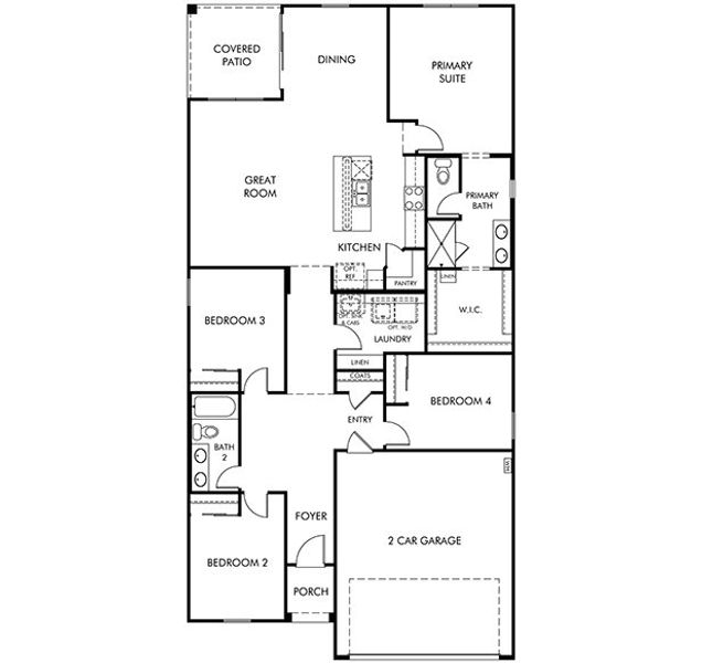 The Mason’s great room, flex space, porch, and patio offer ideal spaces for gathering and entertaining. White cabinets and backsplash, with wood look flooring and primary bath wall tile in the Divine package.