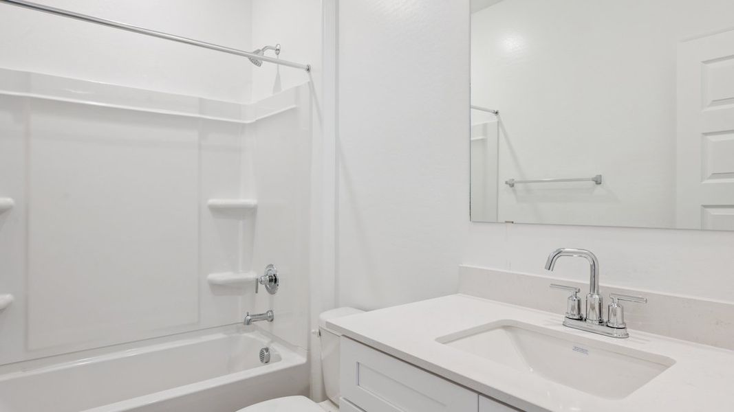 The Hayden floor plan, encompassing 2,096 sq. ft., offers 5 bedrooms, 3 bathrooms, and a 2-car garage. This well-designed layout strikes a balance between comfort and style, perfect for the needs of any resident. The entry leads you past the additional 4 bedrooms and 3 bathrooms, conveniently placed for easy access and functionality. These bedrooms are generously sized for houseguests or personal use. The home's open-concept great room, dining area, and kitchen serve as an ideal space for entertaining or relaxation. The kitchen offers abundant cabinetry, counter space, and a large island ideal for meal prep. The cozy dining area adjacent to this space allows for no interruption in conversation while cooking or dining. The primary bedroom is located at the back of the home, allowing for private serenity with a generously sized walk-in closet and bathroom. The bathroom features modern fixtures and a dual-sink vanity. The covered patio allows for the hosting to continue outdoors, serving as a well-suited place for dining, games, or relaxation. Located in the luminous community of Moonlight.