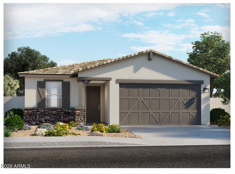Brand new, energy-efficient home! This charming single-story will immediately have you dancing for joy. The open floorplan with a kitchen and a great room of the Sawyer is perfect for entertaining friends. Whether you're hosting a dinner party or preparing a casual meal, this kitchen has everything you need featuring umber dark cabinets with hardware, granite countertops and a generous amount of tile. The open layout encourages a welcoming atmosphere for gatherings and socializing while offering 3 brms and 2 baths. Move-in ready homes including washer, dryer, fridge and blinds are now available in Anthem at Merrill Ranch in Florence. Residents will enjoy homes featuring flex spaces, covered back patios, secluded primary suites and more. Experience the comfort and peace of mind.