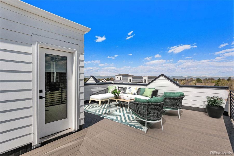 Move-in ready, new west-facing corner townhome with a rooftop deck and access to a private lake. On the first level, walking in from the front porch, you will enter the flex space – perfect for an office/den/guest space/gym/playroom – you choose! You will also find a ¾ bathroom, a large coat closet, a mud space with a bench and hooks, a storage closet, and a 2-car garage with EV charger. The elevated main level on the second floor is a big open space with 10-foot ceilings, a large living room with a gas fireplace, and a balcony with a gas line for your grill. Then there is the dining room, and the large kitchen with tons of storage, a gas stove, a picture window over the sink, and a large pantry. There is a guest powder room privately tucked away from the rest of the space. Up to the third level, you will find the oversized primary suite with a large walk-in closet, an attached bathroom with double vanities, a perfectly sized fully tiled shower with a bench, and an enclosed water closet for privacy. Down the hall is the laundry closet, which fits full-size side-by-side machines. Then there is the second bedroom and a full bathroom. The grand finale on the top level is the huge rooftop deck that feels private and open at the same time and offers views of the mountains and a winter view of the lake, plus a gas line. Colorado-based family-owned Koelbel Communities builds the home, which is in the gated community of Prelude at TAVA Waters. The community has been called “an oasis in the city” as it has a private lake, walking paths, large trees, and a resort-style amenity center with a pool and hot tub with lake views and a state-of-the-art gym. A definite must-see! It is located next to the Highline Canal, less than 5 minutes from Lowry, minutes to Cherry Creek North, Anschutz Medical Center, downtown Denver, and DIA. Mortgage Rate Buy Down Incentives are available for this home. Ask Natalie about how we can help you lower your monthly payments.