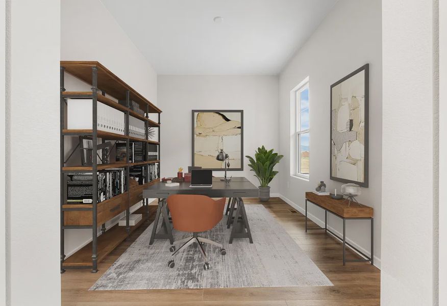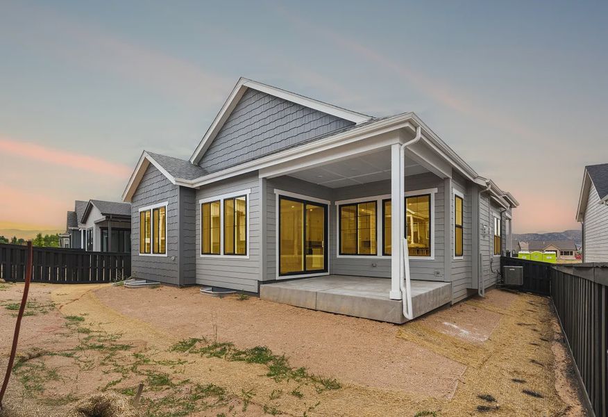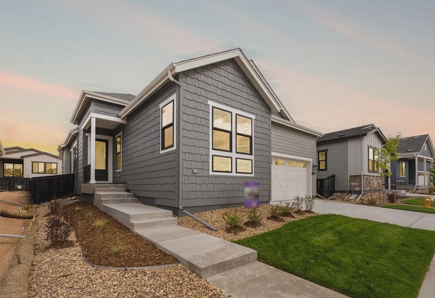 Beautiful one-story home in the desirable Solstice Community. Solstice is surrounded by Chatfield State Park on 3 sides of the community and acreage parcels on the 4th side. This home features 2 bedrooms, 2.5 baths, study with barn door, fireplace with full height tile surround, covered patio, and 2-bay garage. Design finishes include Shaw luxury plank flooring in Truffle, AZT/DT engineered stone stone counter tops in New Venatino Beige and Bianco Pearl, and Yorktowne/Shaw cabinets in White Icing and Smoke. Please contact a community representative for details. The Mirabelle Metropolitan Districts provide various services to the property and in addition to the estimated taxes, a $40 per month operations fee is imposed.
