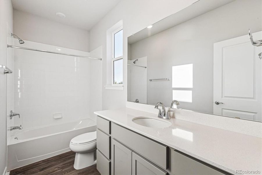 Garden-level basement, on the main floor of this elegant two-story floorplan, you’ll be inspired by open-concept layout, anchored by a spacious great room, an ample dining area and a well-appointed kitchen—boasting a generous walk-in pantry, center island and direct access to the back yard. Additional main-floor highlights include a private study, a valet entry off the garage and an oversized coat closet. As you make your way upstairs, you’ll find three secondary bedrooms (one with its own private en-suite bath and the other sharing a hall bath) a conveniently located laundry room, loft, and a spacious owner’s suite, featuring a walk-in closet and deluxe private bathroom with dual vanities and walk-in shower. The full basement features 9' ceilings and rough-in plumbing for future bath. Interior finishes include white cabinets, quartz counter tops, stainless steel appliances, LVP flooring throughout entire main level, upgraded carpet/pad, stainless steel appliances, full kitchen backsplash, open railing, tiled bathroom floors and more! Pictures are of similar model.