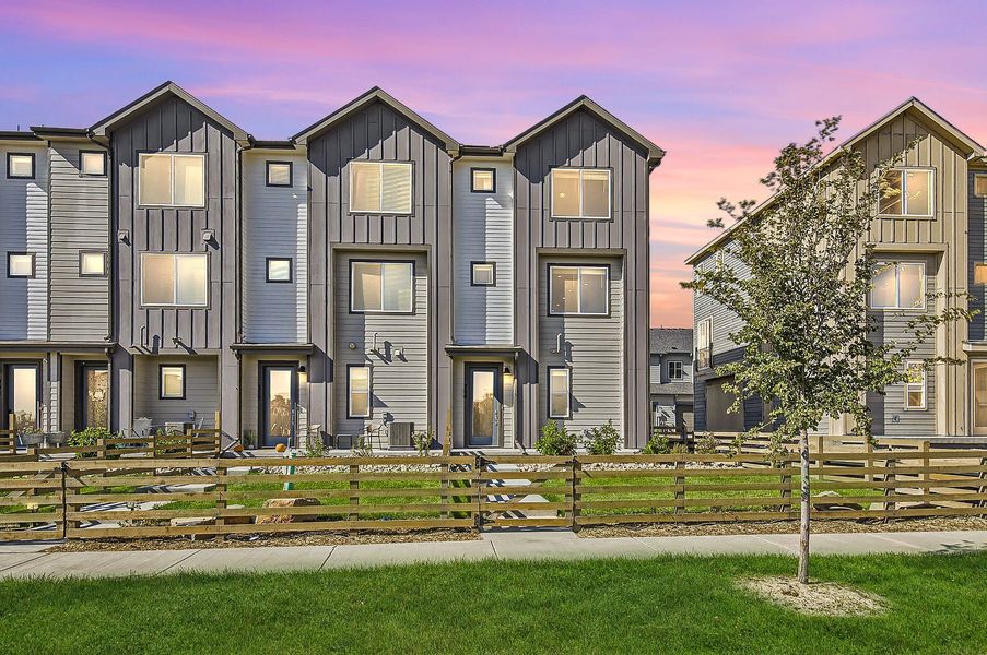 The Horsetooth floorplan is a versatile three-story townhome designed with two bedrooms, two full bathrooms, and an additional half bathroom for convenience. On the first floor, you'll find a spacious one-car garage and a flexible space that can serve multiple purposes, ideal for a home office or hobby room. Ascend to the second floor, where the open layout seamlessly connects the great room with a cozy optional fireplace and a dining area adjacent to a well-appointed kitchen, perfect for entertaining. The third floor is dedicated to privacy, featuring the primary bedroom with a private bath and walk-in closet, as well as a second bedroom complete with its own closet and nearby full bath. This floor also includes a convenient laundry area, bringing functionality to every corner of the Horsetooth.