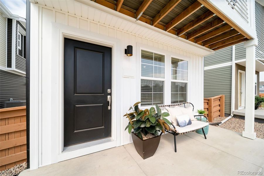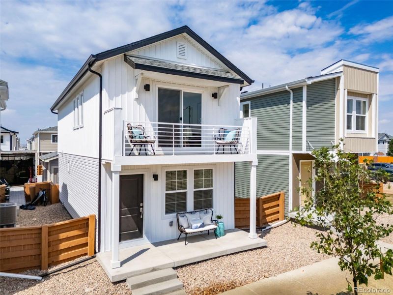 Welcome to the Newton – Modern Living in Reunion. Take advantage of $10K Flex Cash when using our preferred lender! Restrictions apply. See sales counselor for details. This thoughtfully designed 1,166 sq. ft. home offers 3 bedrooms, 2 bathrooms, and a flexible layout that adapts to your lifestyle. Step onto the charming front porch—perfect for morning coffee in the fresh Colorado air. Inside, a versatile flex space can be customized as a home office, fitness nook, play area, or creative studio. Two bedrooms and a full bathroom are also located on the main floor. A sliding glass door off the flex room leads to your private, fully fenced backyard—great for grilling or a small garden. Upstairs, retreat to the spacious primary suite with a private bathroom and a layout designed for comfort and privacy. At the heart of the home, the kitchen features a generous eat-in island, ample cabinet space, and Bengal White granite countertops—perfect for everything from breakfast to meal prep. The stainless-steel appliance package includes a freestanding range, canopy hood, microwave, French door refrigerator, and dishwasher. The open-concept living room on the upper level is perfect for relaxing or entertaining, filled with natural light. Just off the living room, step onto your private balcony—ideal for quiet moments with a cup of coffee. Additional features include Shaker Glacier White cabinets with soft-close drawers, satin nickel cabinet pull bars, Bengal White granite in the bathrooms, and window coverings on main windows.