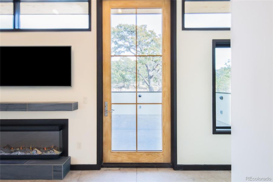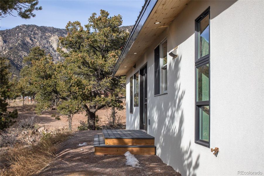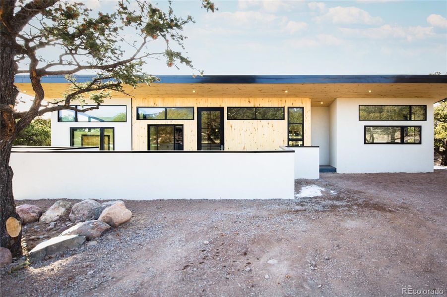 Modern, light filled energy efficient new construction 1200 sq ft 3 bd, 2 ba with SPECTACULAR mountain views! Lovingly built by local resident builder Noah Abrams, this beautifully crafted space features 3-zoned in-floor radiant heat encased in stamped concrete floors, and high ceilings with double stacked windows to frame in the Sangre De Cristo Mountain range. A large front patio with solid stucco walls, complete with inset perimeter lights creates a perfect privacy wall from the street. The sleek design of the house, with solid pine doors, dark framed windows, and light walls helps highlight the views of nature in all directions. Once inside through the oversized window pane door, the open concept home is both warm and inviting. The large eat in kitchen provides ample counter space for any level of cooking prowess and entertaining, with new stainless steel appliances, easy clean Corian countertops and spring loaded charging stations that rise up from the counters, along with under-mount cabinet lighting so that cooking prep is always well lit. A remote controlled electric fireplace heater provides ambiance and heat for the adjoining living/dining space, and backyard access to a 1/4 acre of pinion and juniper forest. Two ample bedrooms on the north side of the house share the full bath with sleek white quartz and stainless fixtures, and includes a deep jet bathtub. The primary wing to the south features abundant sunlight in two directions, a modern fan for circulation, and a large 3/4 sleek bathroom with a large double headed walk-in shower, hidden behind two sliding barn doors. Beautifully positioned so that only the natural beauty outside is visible, this house is a must see! 10 minutes to the town of Crestone for groceries, gas, hardware store, and restaurants, and a quick drive to world class hiking and hot springs. Come find your bliss in this exceptional Crestone home!