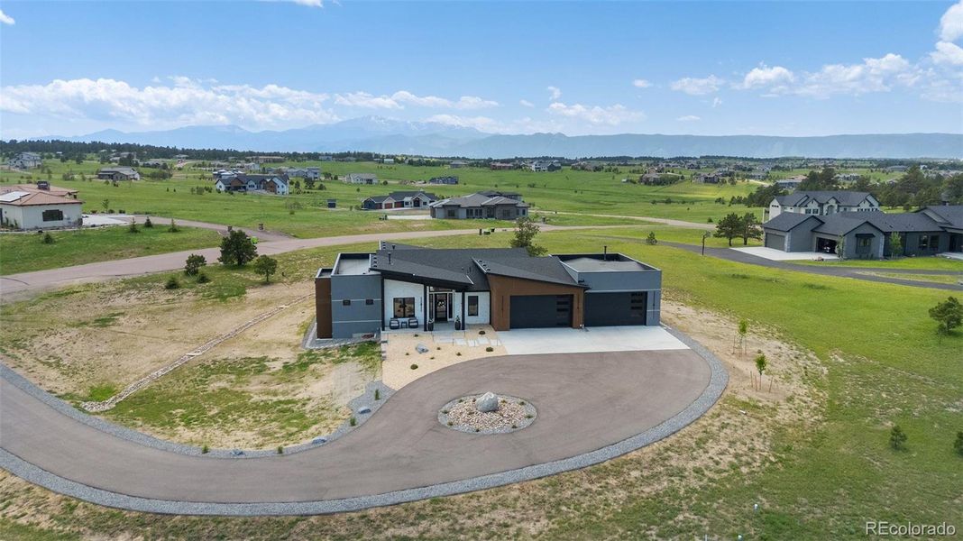 Modern Elegance Meets Mountain Majesty. This sleek, architecturally stunning modern masterpiece sits on 2.68 acres of serenity framing unobstructed views of Pikes Peak. Exterior materials Nichiha, stucco and stone are low maintenance. Designed by & for the discerning buyer, every line, finish, & feature reflects refined simplicity and high-end function. 5 spacious bedrooms (two on main plus office & 3 in lower walk out level all with en suite), 5.5 luxurious bathrooms, & dedicated office enclosed with glass; back patio with fireplace to enjoy breathtaking views; stairs to access to lower walk out custom, heated courtyard. This home effortlessly provides modern chic, style and flair. The gourmet kitchen is a chef’s dream, anchored by soft-close custom cabinetry, a six-burner gas range with two additional ovens, a double oven-microwave combo plus expansive prep space—perfect for entertaining or intimate meals. Seamless flow to dining space with large windows; wine bar area and additional full butler pantry for food prep complete with sink, freezer and ice maker & additional shelving with door to shut away the work space. Thoughtfully designed laundry drop zone with natural light, utility sink, dual closets, & sliding pocket door for effortless flow and privacy. Main master has access to back patio (plumbed/wired for hot tub); private laundry in large custom closet. The bathroom's unique design boasts wet room, heated floors, two private WC areas, remarkable dual sink vanity with stylish cabinets and tile work. The walk-out basement transforms into a private retreat or party hub with a full wet bar, complete with fridge with ice maker, dishwasher and glass space ready for temp or humidity control - ideal for hosting with style. Clean modern open-concept living with abundant natural light that defines every space. A rare fusion of minimalism and sharp design - this home is the pinnacle of sleek architecture and design with appreciation for contemporary mountain living.