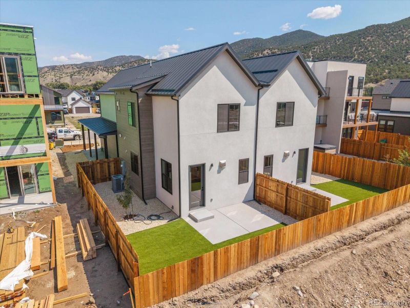 Mountain modern townhouse backing Cleora Park with clean lines and a bright, inviting floor plan. Brand New townhome with 3 bedrooms, 2.5 baths, as well as additional loft space. Light floods into this home throughout and you'll love the excellent use of space and design details present in the architecture. The kitchen features rift sawn cabinetry, a spacious island, and a fresh, clean design. White oak hardwood floors, gas fireplace, Andersen windows, quartz countertops throughout, and central A/C are just a few of the features present. Large over-sized 1-car garage provides room for extra storage and comfortable parking. Backyard is fully fenced with west and south facing light and Methodist Mountain views. Wake up to additional mountain views to the west. Neighborhood is close to multi-use trails along the South Ark, and Two Rivers Commons business district with many shops including a bakery, restaurants, cocktail bar, gym, and many more coming soon.