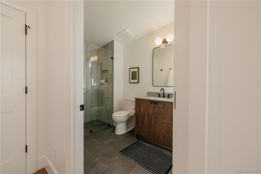 The spacious primary suite features large windows, a freestanding tub, and a curbless walk-in shower for a luxurious spa experience. A dedicated office with a private exterior entrance provides a quiet space for work or meetings, while the mudroom with custom lockers ensures convenient organization.