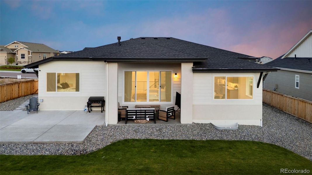Absolutely stunning and like-new, this 4-bedroom, 3-bathroom, 4-car garage home is now available in North Colorado Springs. From the moment you arrive, you’ll be captivated by its incredible curb appeal, featuring a fully landscaped, level lot and a striking black and white stucco exterior. A spacious front courtyard leads to a sleek, modern front door, setting the tone for the stylish interior that awaits. Inside, you're welcomed by an expansive open floor plan with LVP flooring throughout. The living room features a floor-to-ceiling stone fireplace, creating a dramatic and eye-catching focal point. From there, the space flows seamlessly into the gourmet kitchen, complete with beautiful matching marble countertops and backsplash, stainless steel appliances—including double ovens and an industrial-style vent hood—and an oversized island with seating for six. Modern brown cabinetry paired with elegant custom gold hardware adds the perfect finishing touch. A spacious dining area sits just off the kitchen, ideal for daily meals or entertaining. Natural light pours into the main level through oversized windows and large double sliding glass doors, leading to a covered patio and a beautifully maintained, fully fenced backyard. Also on the main level is a stylish office with custom wainscoting. As well as a secondary bedroom and full bathroom, and a luxurious primary suite. The primary retreat features a spa-like 5-piece en suite bathroom with unique modern tile, bold black fixtures, a standalone shower, a stunning soaking tub, and a large walk-in closet. The finished basement expands your living space with two additional bedrooms, a full bathroom, and a massive entertainment area offering endless possibilities—from a media room to a home gym or game room. Built in 2025 with numerous upgrades and refined modern finishes, this home offers warmth, style, and functionality at every turn. It’s move-in ready and sure to impress—schedule your showing today before it's gone!