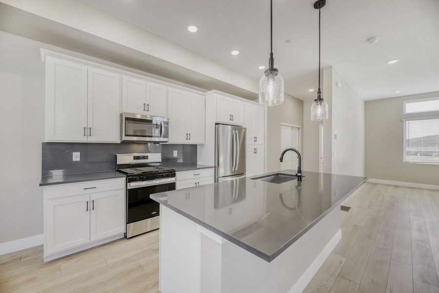 The first level features a flexible studio space that can easily adapt to your lifestyle—ideal as a home office, fitness room, guest space, or creative retreat—along with access to the attached garage. On the second floor, you’ll find an open yet well‑defined layout where the kitchen, dining, and living areas flow seamlessly together, creating the perfect setting for everyday living or hosting gatherings. The kitchen is thoughtfully designed with modern finishes and ample workspace, while natural light fills the living areas.