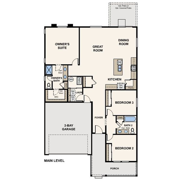 Upon entering the smartly designed Cimarron plan you'll find two secondary bedrooms off the foyer with access to a full hall bath. Beyond the foyer, an inviting kitchen with a center island overlooks an open-concept great room and dining area with access to the backyard—perfect for entertaining. Tucked in its own corner of the home, a secluded owner's suite features an attached bath and spacious walk-in closet. Completing the home, a laundry room is conveniently located in the center of the floor plan.