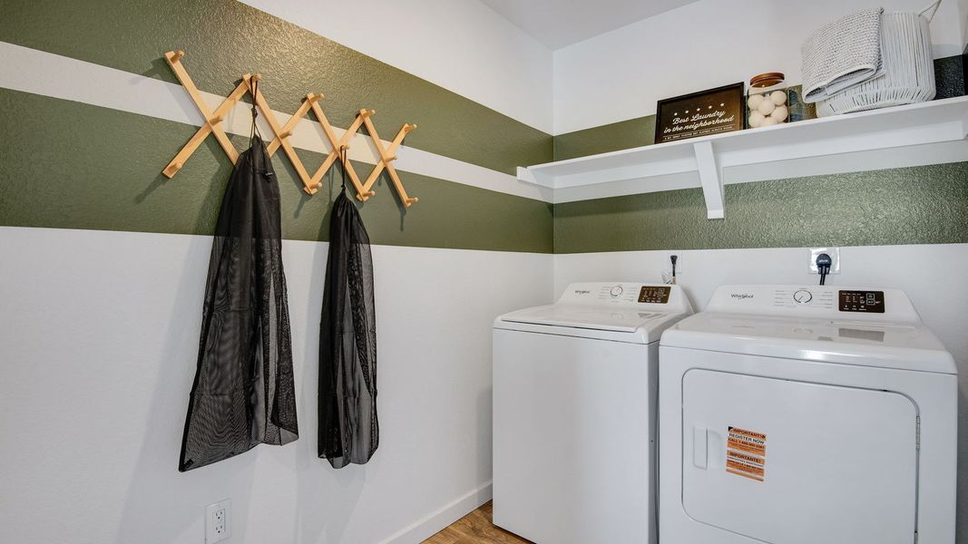 Upstairs, the primary bedroom is complemented by a walk-in closet and private en-suite bath. Two secondary bedrooms share a full bathroom, and the laundry room is located nearby for added convenience.