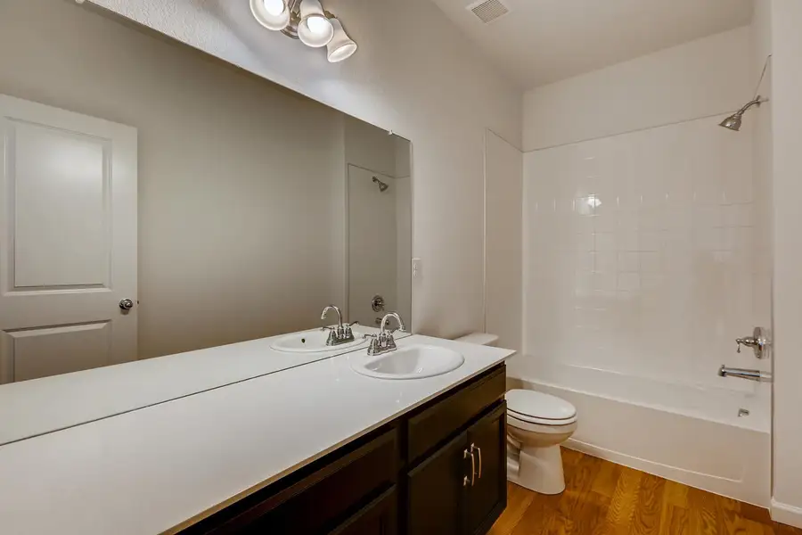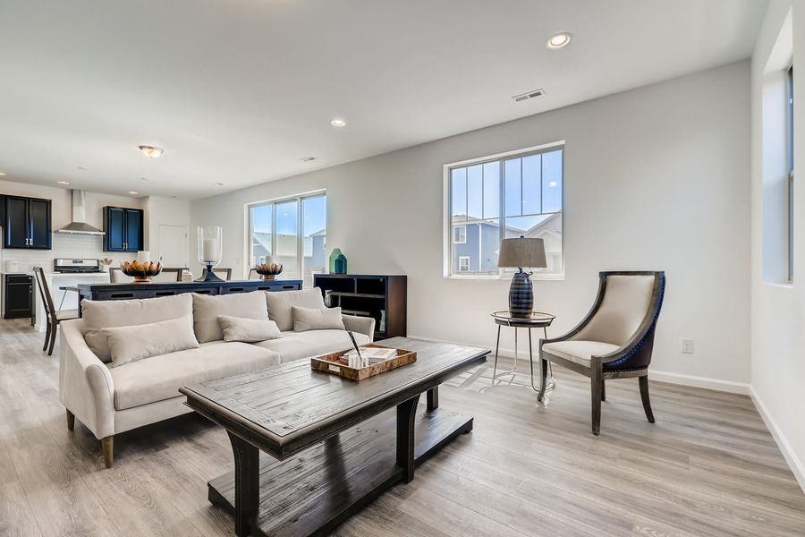 The Antero model is thoughtfully designed modern living, featuring 3 bedrooms, 2.5 bathrooms, and a 2-car garage—perfectly balancing comfort and functionality. The main floor showcases an open-concept layout that seamlessly connects the luxury kitchen which boasts a 36-inch gas range, a hood and a combination microwave and oven, dining room, and a spacious great room centered around a warm, inviting fireplace. This creates a bright and welcoming atmosphere ideal for everyday family life and entertaining guests. A convenient half bath completes the first level for added practicality. Upstairs offers three bedroom including the spacious primary suite with a large walk-in closet for ample storage. The well-placed laundry room on this level adds convenience to your daily routine. Combining style with smart design, the Antero plan offers a flexible layout that adapts effortlessly to modern lifestyles. Images are of similar homes or digitally staged.