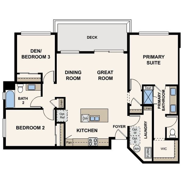 A smartly designed single-story floor plan, Residence 3A at Grand Vue offers an abundance of flexible living space. Upon entering the foyer, you’ll be greeted with a dazzling open-concept layout—anchored by a well-appointed kitchen with plenty of storage space. A generous laundry room is also located off the foyer. Beyond the kitchen, an expansive great room and dining area provide direct access to a sizeable outdoor deck that's perfect for entertaining. For private living spaces, you'll appreciate a spacious secondary bedroom and a versatile den with access to full hall bathroom. And on the opposite side of the home, a deluxe owner’s suite boasts a large walk-in closet and a lovely private bath with dual vanities and a benched shower. This home is complete with the stylish Melody design package, boasting gray cabinets and a coordinating backsplash for a clean, modern finish.