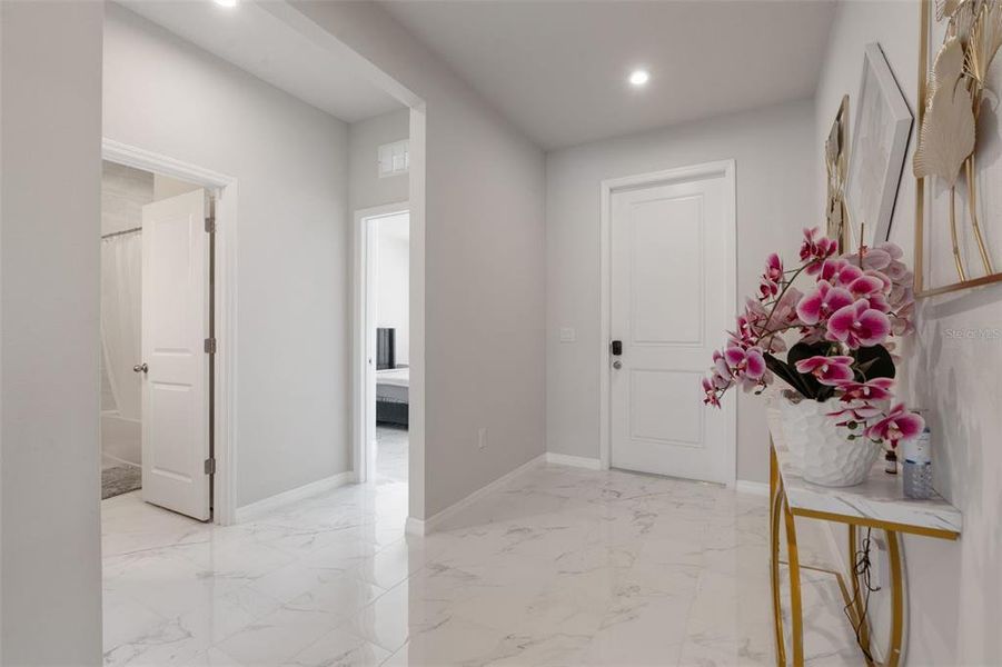 $20,000 PRICE DROP!! Welcome to this 3 bedroom, PLUS office/4th bedroom, 2-bath single-story home built in 2023, in the highly sought-after Park Meadows community. With low HOA fees and No CDD, this home combines modern living with exceptional value & comfort. Through the towering front door you enter a large 7X12 Foyer. You will immediately notice the upgraded porcelain "marble" tile throughout the home, high ceilings and an inviting open floor plan. This is a 3 way split plan, designed for both functionality and privacy. To the right of the foyer is a large 3rd bedroom and a second bathroom with dual vanity, quartz countertops, dark cabinetry and upgraded handles. The tub area has tile all the way up to the ceiling. Next to that is the large office with double french door entry. This would make an excellent 4th bedroom or flex space or keep as an office. To the left is inside laundry room and 2nd bedroom. Continuing through the home is the kitchen, family room dining area combination. The kitchen is a chef’s delight with sleek stainless steel appliances, a spacious walk in pantry, ample cabinet space, and gorgeous Quartz countertops. Enjoy the expansive 9X3 foot island with breakfast bar and seating for 4. There is a large dining space and family room with custom floating entertainment center and designer wall molding. The spacious primary suite offers a large walk-in closet and a spa-inspired bathroom with a walk-in shower as well as his and her sinks with additional space for a vanity station. The extra bathroom includes a tub, duel sinks, and its own spacious linen closet. There is an enclosed screened lanai leading to a partially fenced back yard, The 2-car garage has been upgraded with epoxy flooring to provide durability and a polished finish. Apart from providing exceptional homes, the Park Meadows community also includes a community pool perfect for sunny Florida days and a dedicated dog area for your four-legged friends. This home’s location is unmatched- across from Cypress Creek schools, just 2 miles from the new Johns Hopkins Children’s Hospital, and only 4 miles from the Epperson Lagoon! This move-in ready home offers modern living, fantastic amenities, and a convenient location in one of Wesley Chapel’s most desirable communities — schedule your showing today!