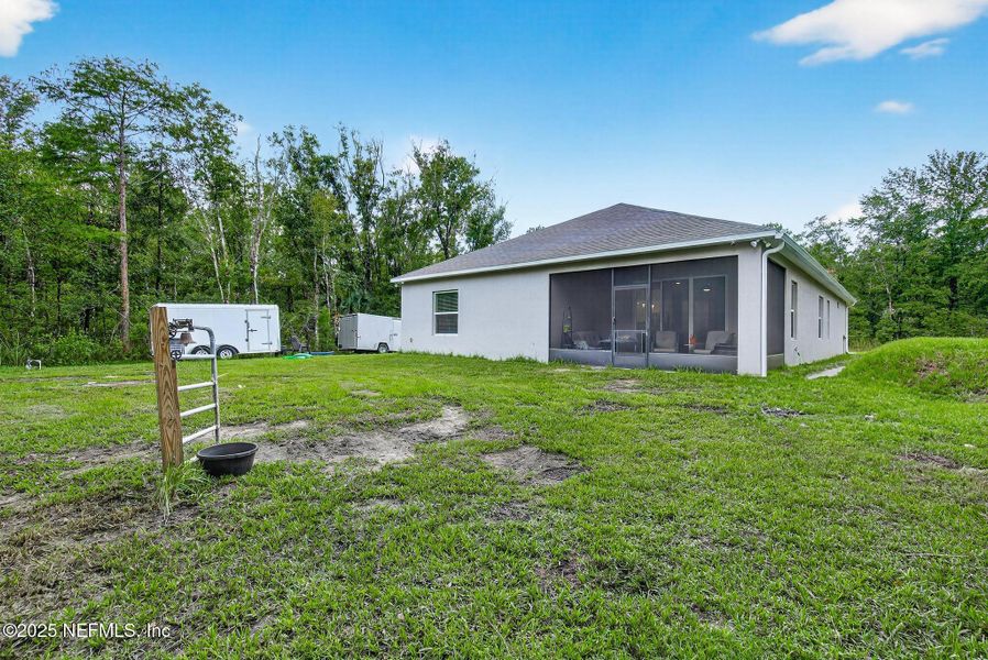 Welcome to your dream home, built in 2023 and nestled on a generous 1.14 acre lot with no HOA fee! This beautifully designed 4-bedroom, 2 bathroom home offers 2151 sq ft of open-concept living space, featuring a split-bedroom layout for ultimate privacy. The heart of the home is a stunning chef-inspired kitchen equipped with quartz countertops, stainless steel appliances, farmhouse sink, reverse osmosis filtration system, and a large island with seating-perfect for family gatherings or entertaining friends. The kitchen seamlessly flows into the spacious dining and family rooms, creating an inviting atmosphere for any occasion. Retreat to the primary bedroom sanctuary, where the spa-inspired bathroom awaits. Enjoy a luxurious soaking tub, double vanities with quartz counters, and a walk-in shower with seating and three shower heads for a true spa experience.... Additional features include 10 ft. ceilings with crown molding * security system * 3-car garage with ample space for vehicles and storage. This exceptional property offers the perfect blend of space, luxury, and modern convenience. With its open floor plan, gourmet kitchen, spa-like primary suite, and spacious lot, this home is sure to impress. Don't miss the opportunity to make it yours! Backyard provides space for a pool or other toys. And yes you can have chickens! Location is a rapidly growing community with 1+acre lots