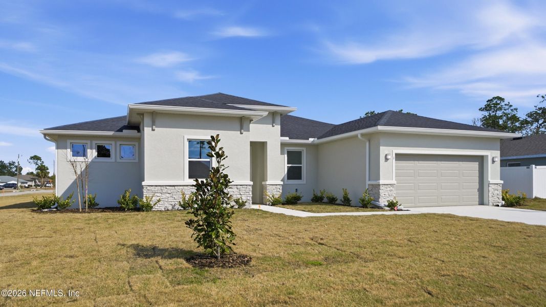 Brand new, fully completed, and energy efficient by Brite Homes, this residence showcases clean, modern design and solid concrete block construction, delivering a durable and low-maintenance living experience. Move-in ready and thoughtfully finished, it offers the advantage of new construction without the wait. The exterior presents strong curb appeal with crisp architectural lines, a stone-accented front elevation, full gutter system, irrigation, and an upgraded modern front door that makes a striking first impression.