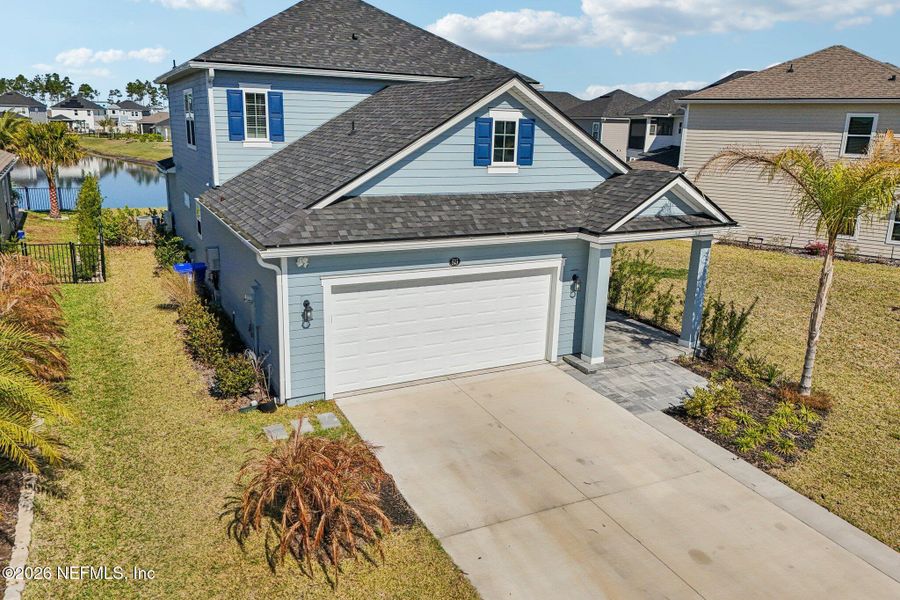 Welcome to this better than new Beacon Lake home on a premium pond view lot, with extra space between neighbors. The versatile floor plan offers an open concept layout with 4-bedrooms + a bonus room, combining the ideal blend of functionality, style, and lifestyle. Wide plank vinyl flooring flows throughout the main living areas, leading you into a beautifully appointed kitchen featuring a custom backsplash, gas range, stainless farmhouse sink, and sleek stainless vent hood. The oversized breakfast bar and adjoining breakfast nook seamlessly connect to the living space, creating a true heart-of-the-home feel. The first-floor owner's suite provides a private retreat with tranquil pond views, complete with an ensuite bath offering dual sinks and a walk-in shower. The upstairs bonus room gives you the flexibility for a media room, playroom, or home office--whatever suits your lifestyle. Enjoy Florida living year-round from your covered back patio with extended pavers, perfect for relaxing or entertaining while overlooking the peaceful water view. A charming covered front porch with pavers adds to the home's inviting curb appeal. Living in Beacon Lake means access to exceptional resort-style amenities, including a 43-acre paddle-friendly lake, sandy beach, lakehouse, splash park, dog park, fitness center, and pickleball and tennis courts--all just minutes from your door. Conveniently located with easy access to shopping, dining, and major roadways, this home truly offers the best of both comfort and community.