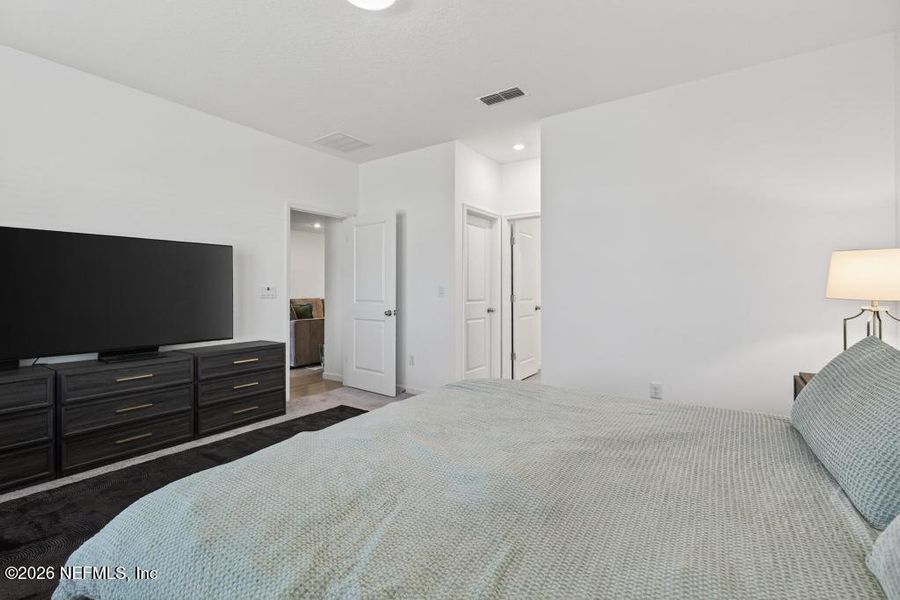 A rare 3.99% VA loan that seamlessly transfers with the home, keeping the difference between price and remaining balance refreshingly minimal. This thoughtfully designed residence blends elevated finishes with modern functionality, featuring white cabinetry, white quartz countertops, 42-inch upper cabinets, and a Frigidaire® stainless steel appliance package. Quartz vanities and ceramic wood-look tile throughout the main living areas create a clean and cohesive interior, while upgrades such as enhanced lighting, a custom closet, tiled backsplash, and window blinds add everyday comfort.