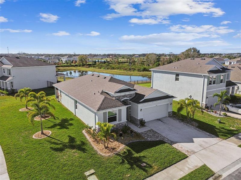 Welcome to easy Florida living in Bella Lago. This beautifully maintained one-story, all-concrete-block home offers the perfect blend of comfort and open-concept design across 2,045 sq. ft. of thoughtfully used space. Step inside to a bright, flowing layout where the open floor plan connects the living, dining, and kitchen areas—ideal for both everyday living and entertaining. The kitchen features white cabinetry, quartz countertops, and a clean, modern feel that continues into the bathrooms with matching quartz finishes. The primary suite is a true retreat with a tray ceiling, his-and-hers walk-in closets, and a spacious ensuite bath complete with dual sinks, an extra-large vanity, garden tub, separate shower, and private water closet. At the front of the home, you’ll find two secondary bedrooms sharing a full bath, offering a smart layout for guests or family. A fourth bedroom and half bath provide added flexibility for an office, nursery, or flex space. Enjoy Florida’s indoor-outdoor lifestyle with sliding glass doors that lead to a screened-in lanai overlooking peaceful pond views. Updated landscaping and palm trees enhance the curb appeal and tropical feel. Located in the highly desirable Bella Lago community, residents enjoy access to two resort-style pools, a fitness center, a playground, and a dog park. A spacious 2-car garage, quality concrete block construction, and a corner lot make this home as practical as it is beautiful. This one checks all the boxes for comfort, style, and location!