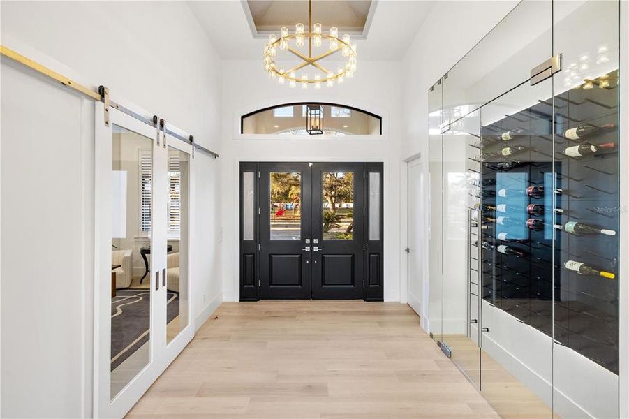 Inside, soaring 18-foot vaulted ceilings and custom tray ceilings enhance the open-concept layout, while 12-foot full pocket sliders seamlessly connect indoor and outdoor living spaces. The living room is anchored by a sleek fireplace, creating a warm yet modern focal point. The chef’s kitchen is equipped with professional-grade gas appliances, a waterfall-edge quartz island, custom cabinetry, and an expansive butler’s pantry for effortless entertaining. A glass-enclosed wine display and tray ceiling details add dramatic appeal. The primary suite features 14-foot ceilings and a spa-inspired bath with a freestanding soaking tub, dual vanities, and a luxurious walk-in shower. All bedrooms include custom California Closets. A designated large office, spacious laundry room, and private gym complete the interior amenities. The home also has a full security system installed.