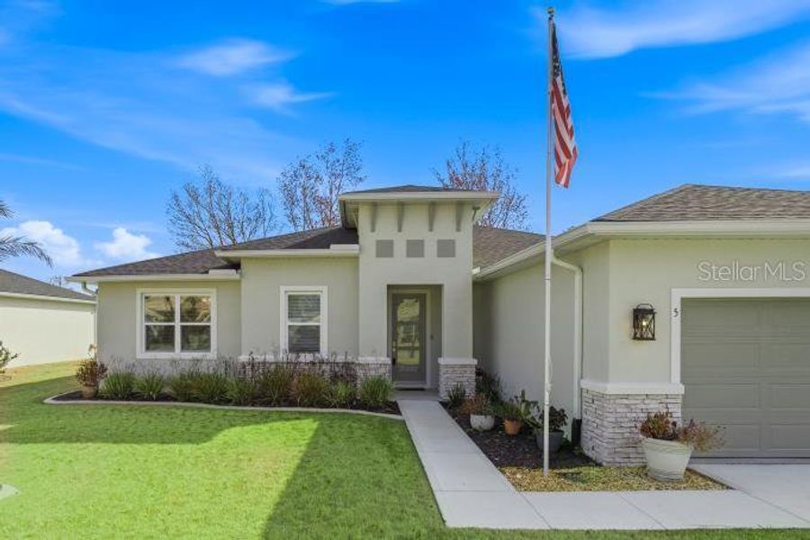 As you arrive, you’ll appreciate the home’s clean, modern exterior with stone-accented stucco, concrete curbing, full gutters, and thoughtfully maintained landscaping. A full sprinkler system and fully fenced-in yard enhance both curb appeal and functionality. Just off the main living space, a covered lanai overlooks a spacious backyard with plenty of room for a future pool.