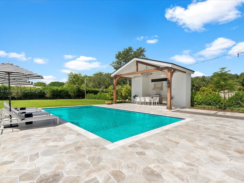 Discover modern elegance in this brand-new, expanded 5-bedroom, 5.5-bath estate encompassing 5,689 sq. ft. of luxury living space. The interior boasts an additional versatile room and a dramatic spiral staircase, impact windows throughout, a living room with soaring ceiling height and a cozy butane fireplace. High-end stunning kitchen that would make any chef blush featuring Wolf gas range, double islands and dual sinks, walk-in pantry, wine bar with cooler, walk-in coffee bar, and a well-designed laundry room. Step outside to your private cabana, complete with a built-in BBQ and sink, perfect for entertaining. A stunning below-ground pool and 3-car garage complete this exquisite home. Located in a desirable neighborhood, this property defines modern luxury. Schedule your showing today!