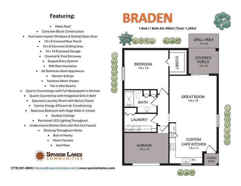 Welcome to easy, elegant 55+ living in our innovative & beautifully designed 1-bedroom Braden model. Featuring concrete block construction, quartz countertops, impact windows, & a metal roof- this home offers both style & durability for those seeking to downsize without compromising value and quality. Enjoy an open-concept living area, full-size washer/dryer in a spacious laundry room, an ample kitchen with stainless steel appliances and a well-appointed bedroom, closet and rear covered porch.