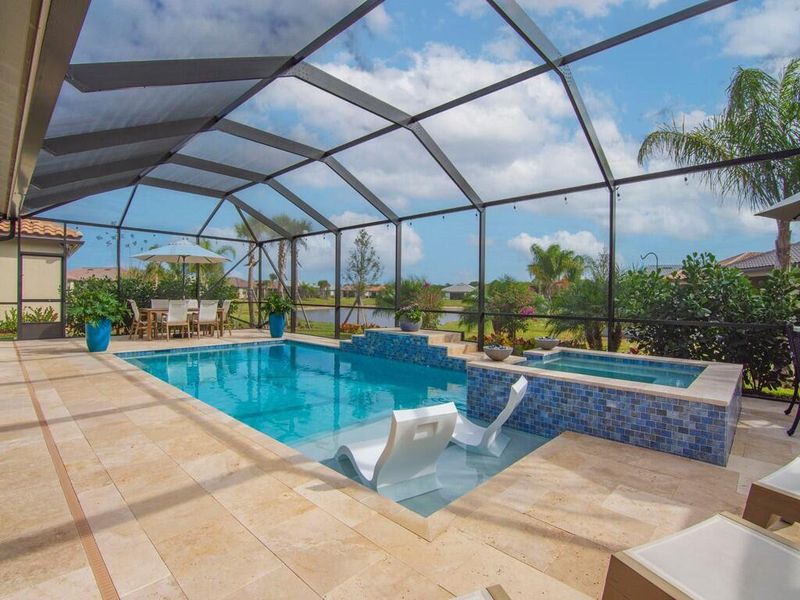 PRICED TO SELL! Highly sought-after Stellar model w/ over $200K in upgrades by current owner. Zero-corner sliding doors open to covered seating area overlooking a NEW screened, salt water, heated, sun-shelf pool & spa w/ 2 waterfalls & travertine tile. Crown molding & detailed trim, shiplap wall, designer bathroom wallpaper, and more. Stunning island kitchen with tons of storage & walk-in pantry. Open concept living w/ private den, office or sitting area. Expanded 3-car garage w/epoxy floors. New landscaping completes your private tropical retreat. Built 2025 w/transferable warranties.