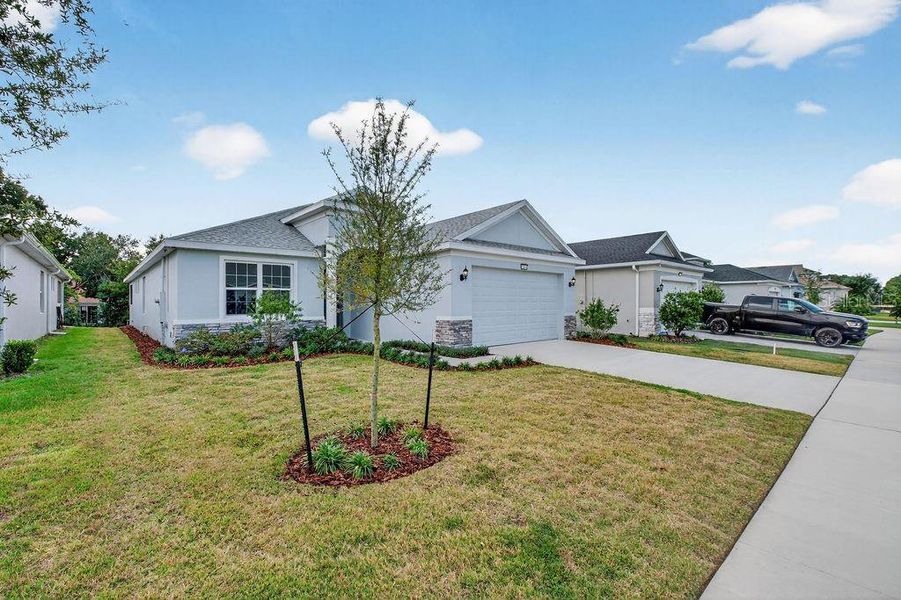 Welcome to this beautifully upgraded home, with NO CDD, nestled in Lakes of Mount Dora, a sought-after 55+ community known for its vibrant lifestyle and impressive amenities, all centered around a full-service community clubhouse. The St. Thomas floor plan presents an exceptional opportunity to own a stylish and modern home. Thoughtfully designed with 3 spacious bedrooms, a versatile den, and 2 well-appointed bathrooms, this home perfectly blends comfort, functionality, and elegance. The kitchen and bathrooms feature quartz countertops, offering a sleek and durable finish, while vaulted ceilings enhance the open feel of the main living areas. Cozy evenings are made even more inviting with the electric fireplace, creating a warm and welcoming atmosphere. Additional highlights include a washer and dryer, a built-in desk in the den/office, and a convenient drop zone near the front entry, ideal for organizing daily essentials such as keys, bags, and shoes. Built by Medallion Homes, this home reflects exceptional attention to detail and quality craftsmanship and is still covered by a builder’s warranty, providing peace of mind.