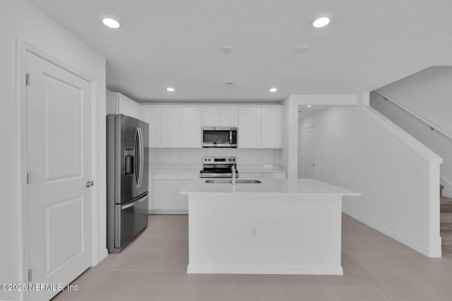 The beautiful Kitchen is designed for gatherings, featuring Stainless-Steel Appliances, White Cabinets, and elegant Quartz Countertops. The center island overlooks the roomy Gathering Room and Café, with doors leading to your outdoor Patio—perfect for hosting guests.